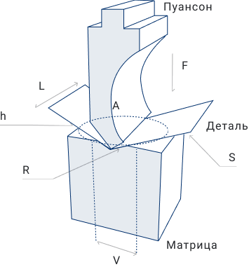 Гибочное усилие F = (1,42 x TS x S2 x L)/1000 x V