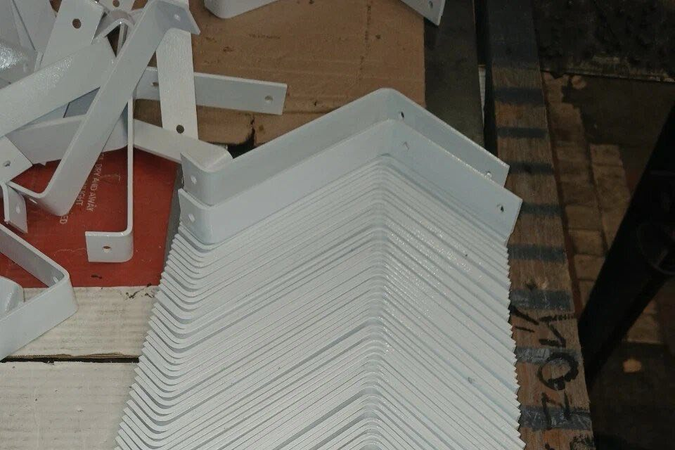 Кронштейны были изготовлены из профильной трубы 20×20×2 мм. Производственный цикл включал резку заготовок, сборку, сварку и последующую защитную окраску. Для изготовления деталей применялись технологии лазерной резки, гибки листового металла, сварки и промышленной покраски, что позволило обеспечить стабильное качество и точность элементов.