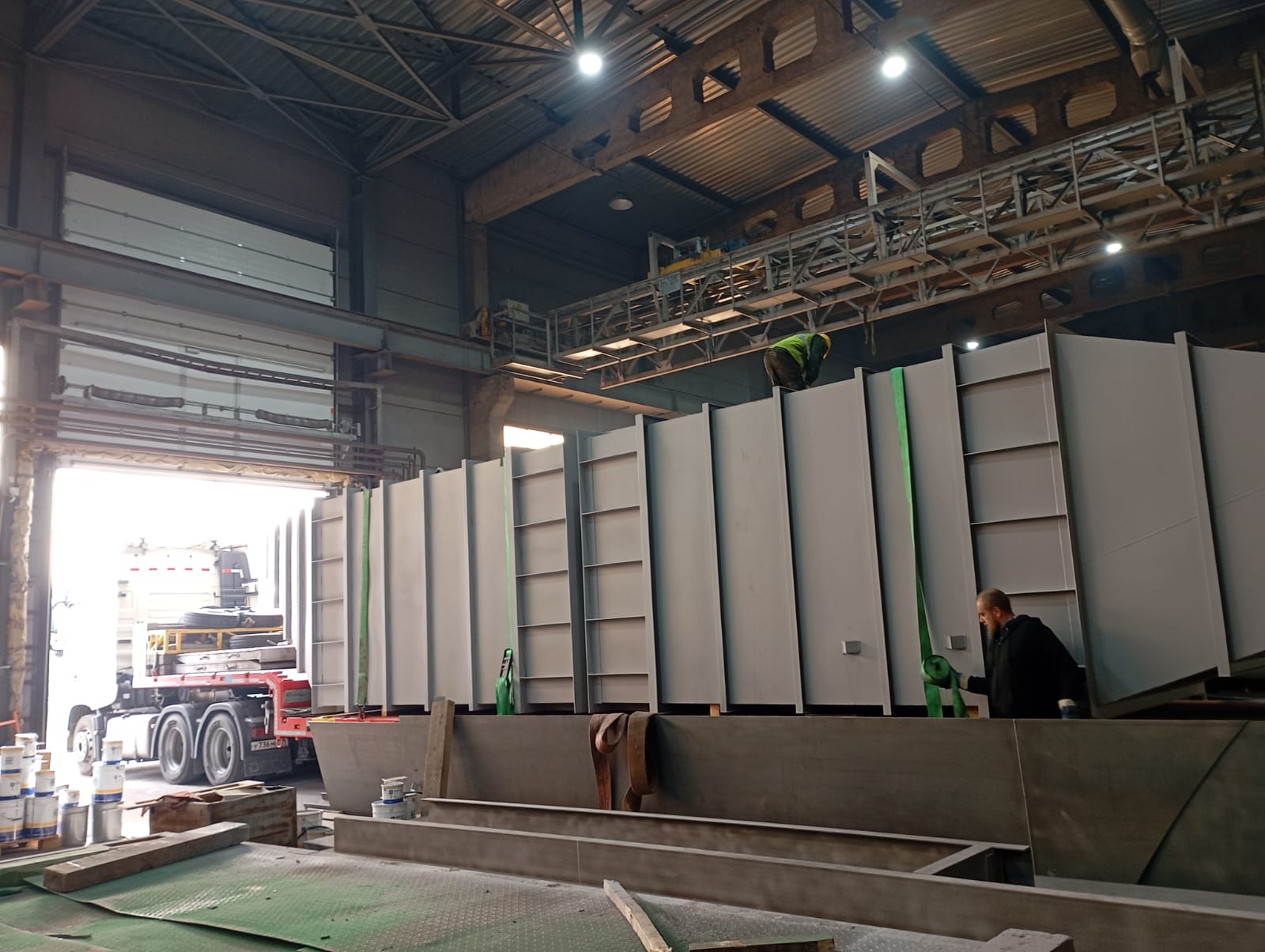 Особое внимание было уделено этапу погрузки. Несмотря на внешнюю простоту, именно здесь требуется точный расчёт массы, правильное распределение нагрузки, надёжная фиксация изделий и чёткая координация всех участников процесса. Эти факторы напрямую влияют на сроки поставки и сохранность конструкций при транспортировке.
