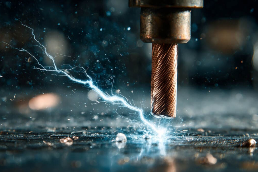 Электроэрозия – это контролируемое удаление части материала с помощью электрических разрядов и диэлектрической жидкости. В ходе работы между инструментом и деталью возникает искровой разряд. В результате микрочастицы вещества плавятся, превращаясь в шлам. Отходы затем удаляются из рабочей зоны.