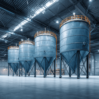 Накопительный бункер (V = 10-25 м³) - универсальное решение для временного хранения сыпучих материалов с системой нижней разгрузки через шиберный затвор.